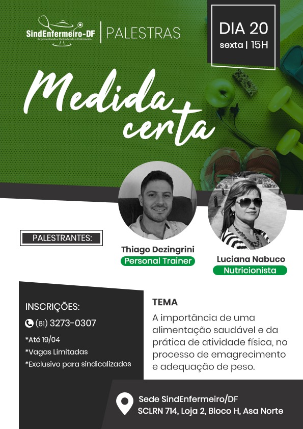 Nessa sexta (20), a partir das 15h, o SindEnfermeiro-DF promove palestras sobre a importância de uma alimentação saudável e da prática de atividade física, no processo de emagrecimento e adequação do peso.